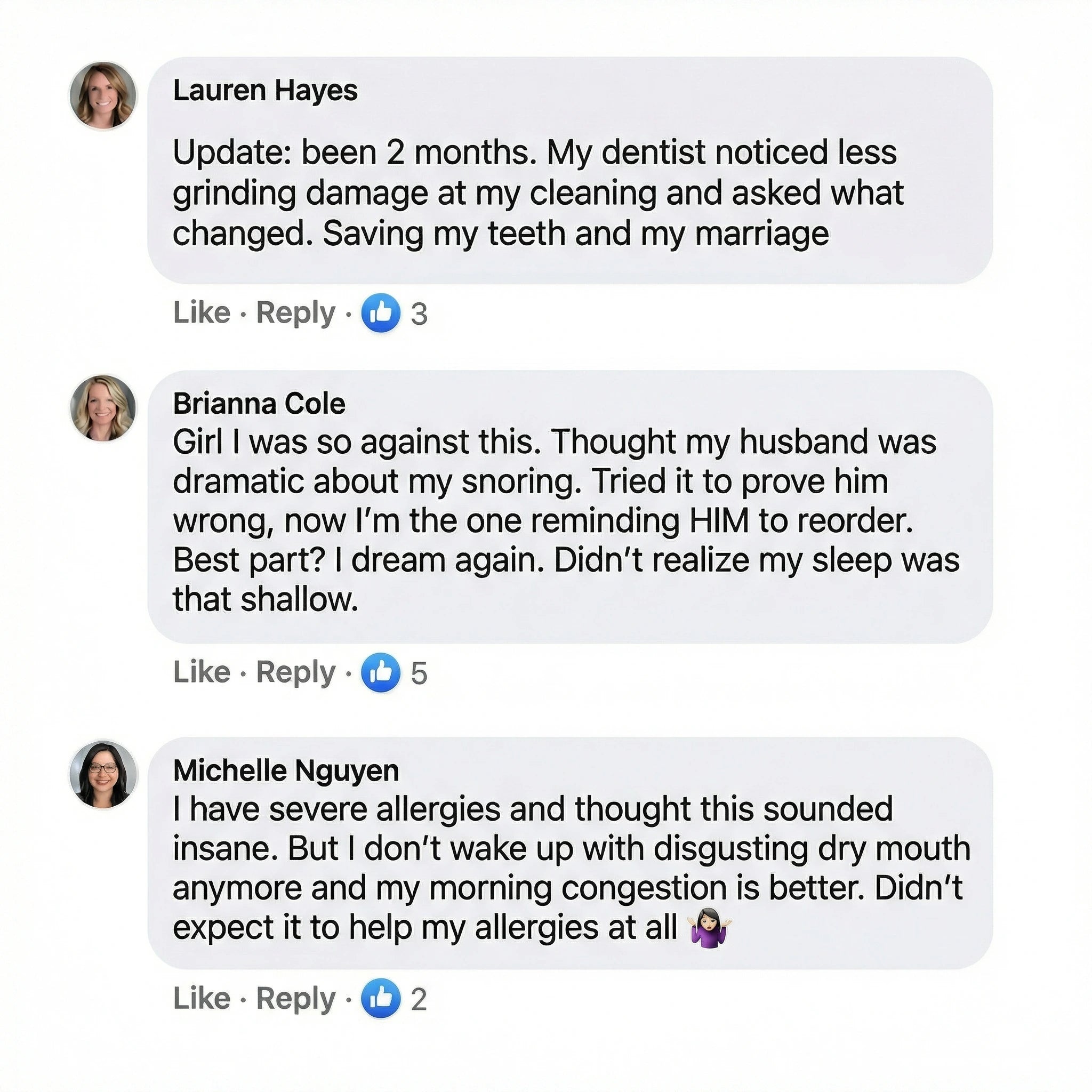 "Sleep quality improved, no more sore throat or dry mouth."