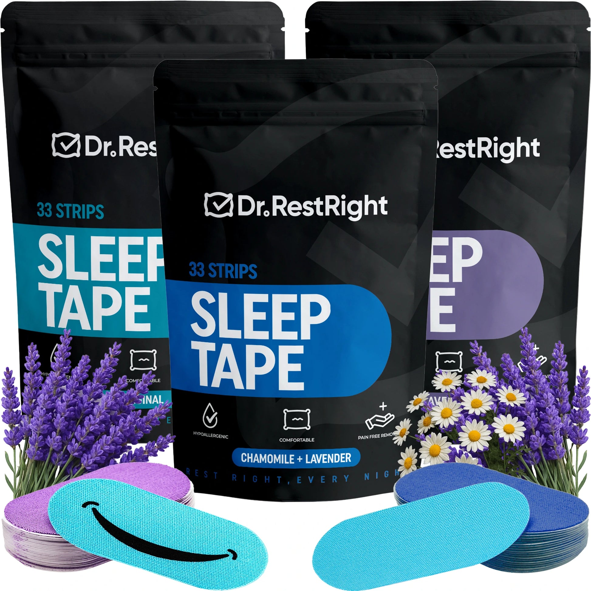 Dr. RestRight Mouth Tape uses breathable, hypoallergenic materials and is infused with soothing chamomile and lavender. It stays comfortably in place, promotes nasal breathing to reduce snoring, enhances sleep quality, and removes without any residue or irritation—unlike other mouth tape.